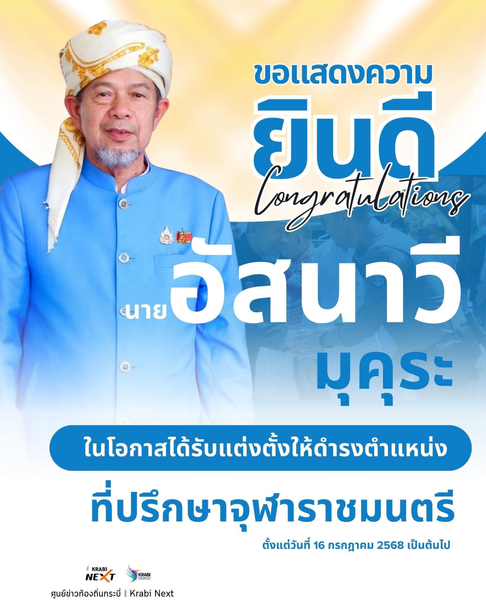 #ชาวจังหวัดกระบี่ขอแสดงความยินดีกับนายอัสนาวีมุคุระ ประธานกรรมการอิสลามประจำจังหวัดกระบี่ .ในโอกาสที่ได้รับการแต่งตั้งให้ดำรงตำแหน่ง 'ที่ปรึกษาจุฬาราชมนตรี' . ตั้งแต่วันที่ 16 กรกฎาคม 2568 เป็นต้นไป . #ศูนย์ข่าวท้องถิ่นกระบี่