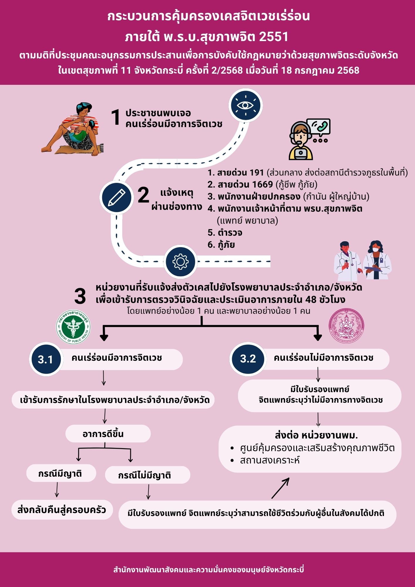 - กรณีที่ 2: “คนเร่ร่อนไม่มีอาการจิตเวช” หากผลวินิจฉัยระบุว่าบุคคลนั้นไม่มีอาการทางจิตเวชหรือไม่ได้ป่วยทางจิตเวช จะมีการ “ส่งต่อหน่วยงาน พม.” เพื่อให้ได้รับการดูแลในรูปแบบที่เหมาะสม เช่น ศูนย์คุ้มครองและพัฒนาคุณภาพชีวิต หรือ สถานสงเคราะห์ ซึ่งเป็นบทบาทของกระทรวงการพัฒนาสังคมและความมั่นคงของมนุษย์ในการให้ความช่วยเหลือทางสังคมแก่ผู้ด้อยโอกาส