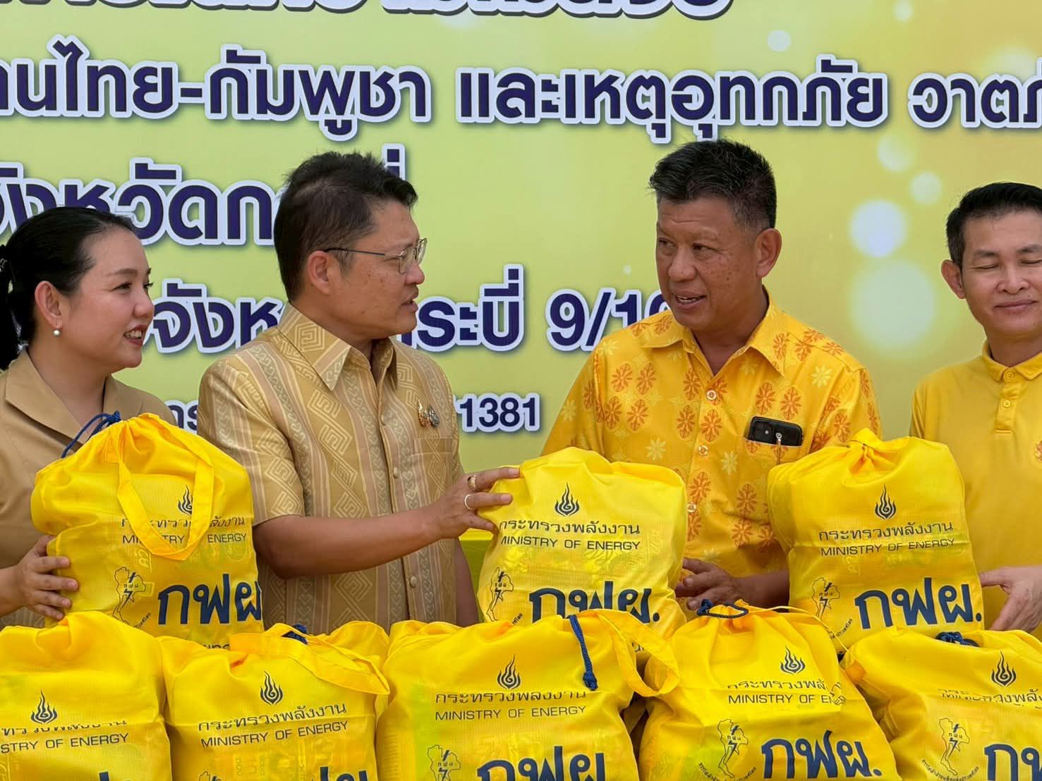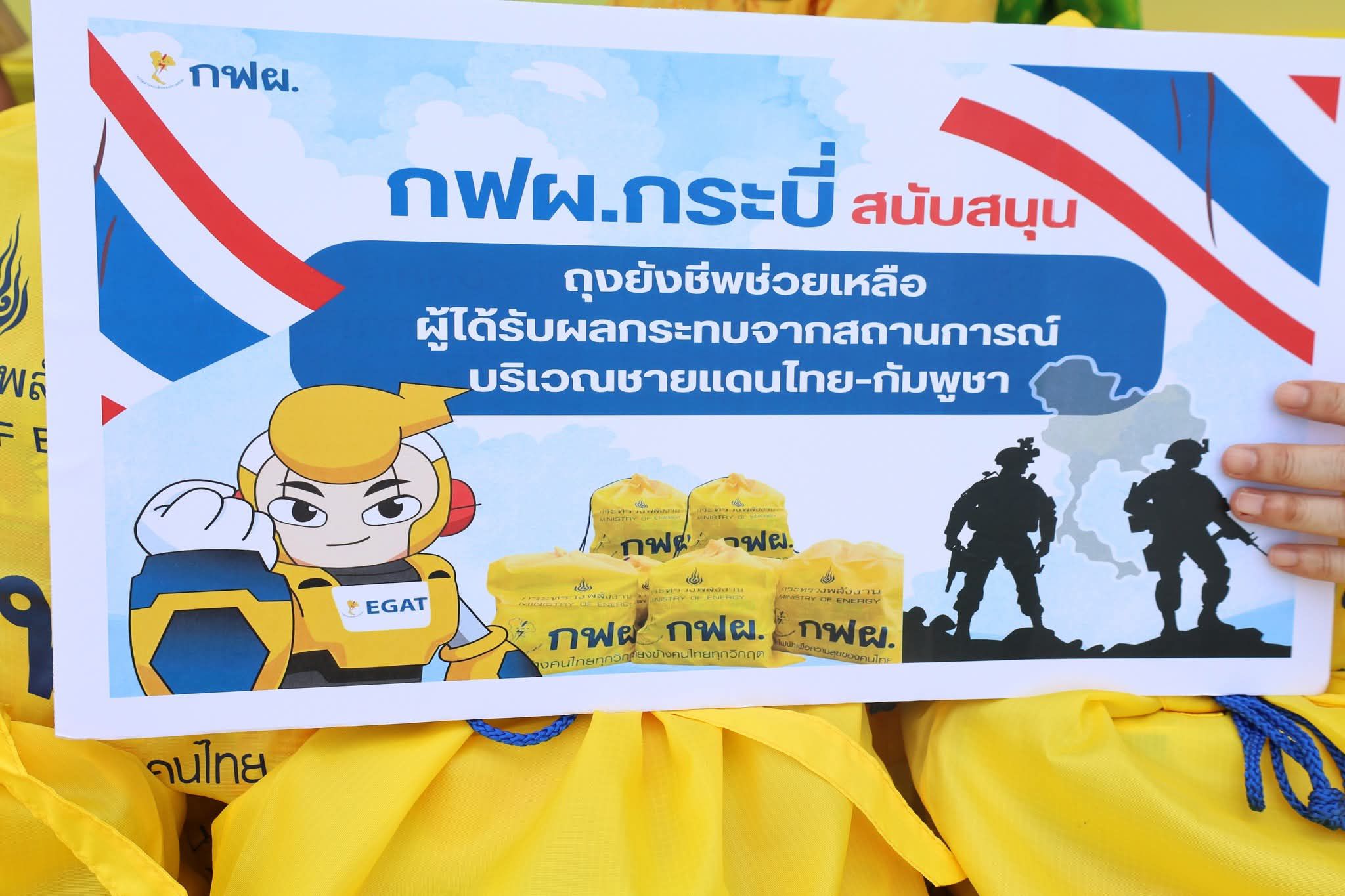 การไฟฟ้าฝ่ายผลิตแห่งประเทศไทย (กฟผ.) โรงไฟฟ้ากระบี่ โดยนายธันยบูรณ์ สกลกิติวัฒน์ ผู้อำนวยการโรงไฟฟ้าภาคใต้ และนายประภากร เตชะประดิษฐ์ ผู้ช่วยผู้อำนวยการโรงไฟฟ้าภาคใต้ เป็นตัวแทนหน่วยงาน มอบถุงยังชีพจำนวน 50 ชุด และน้ำดื่มจำนวน 100 แพ็ค เพื่อสมทบนำไปช่วยเหลือเยียวยาผู้ได้รับผลกระทบจากสถานการณ์บริเวณชายแดนไทย-กัมพูชา และเหตุอุทกภัย วาตภัย