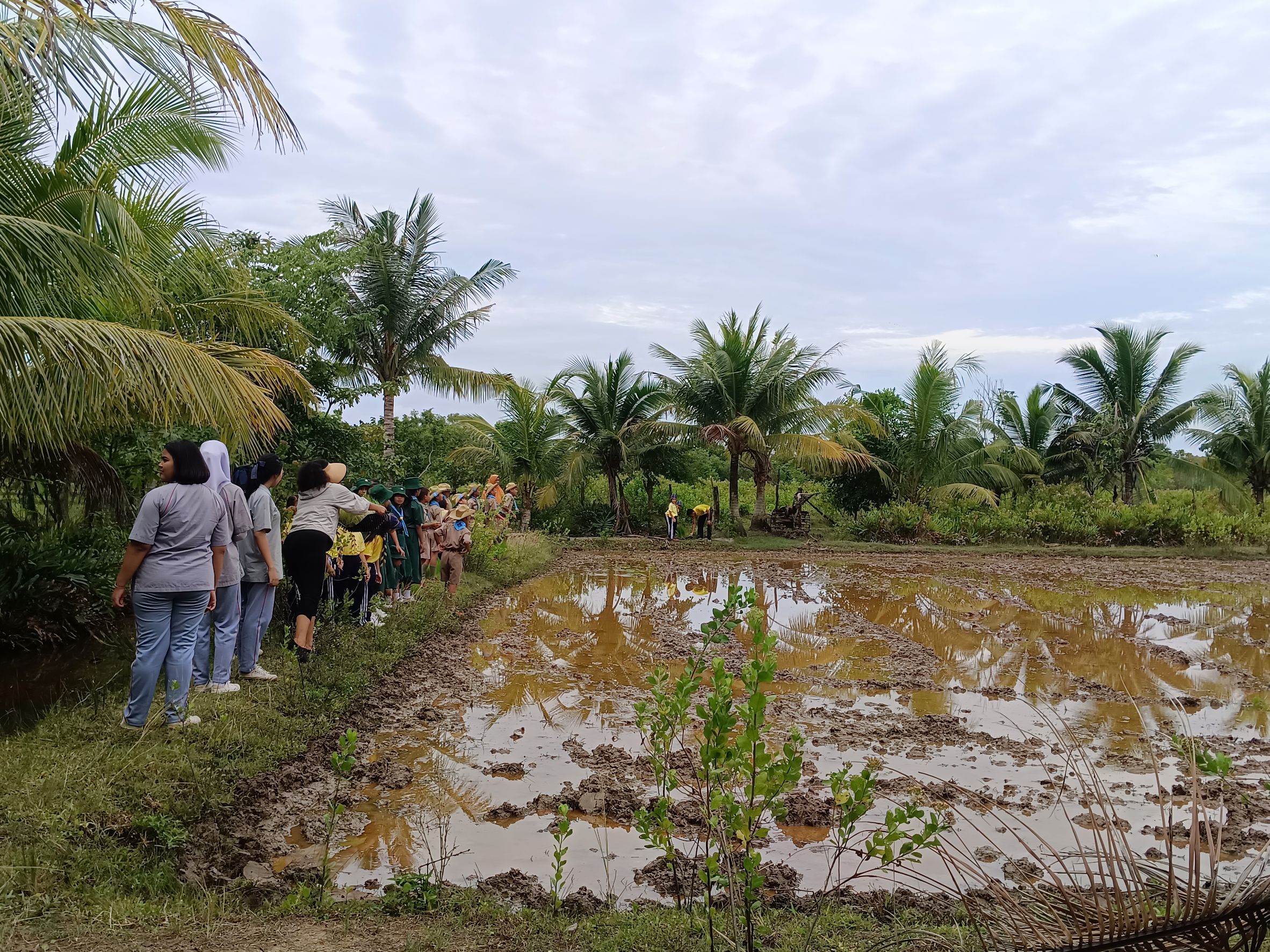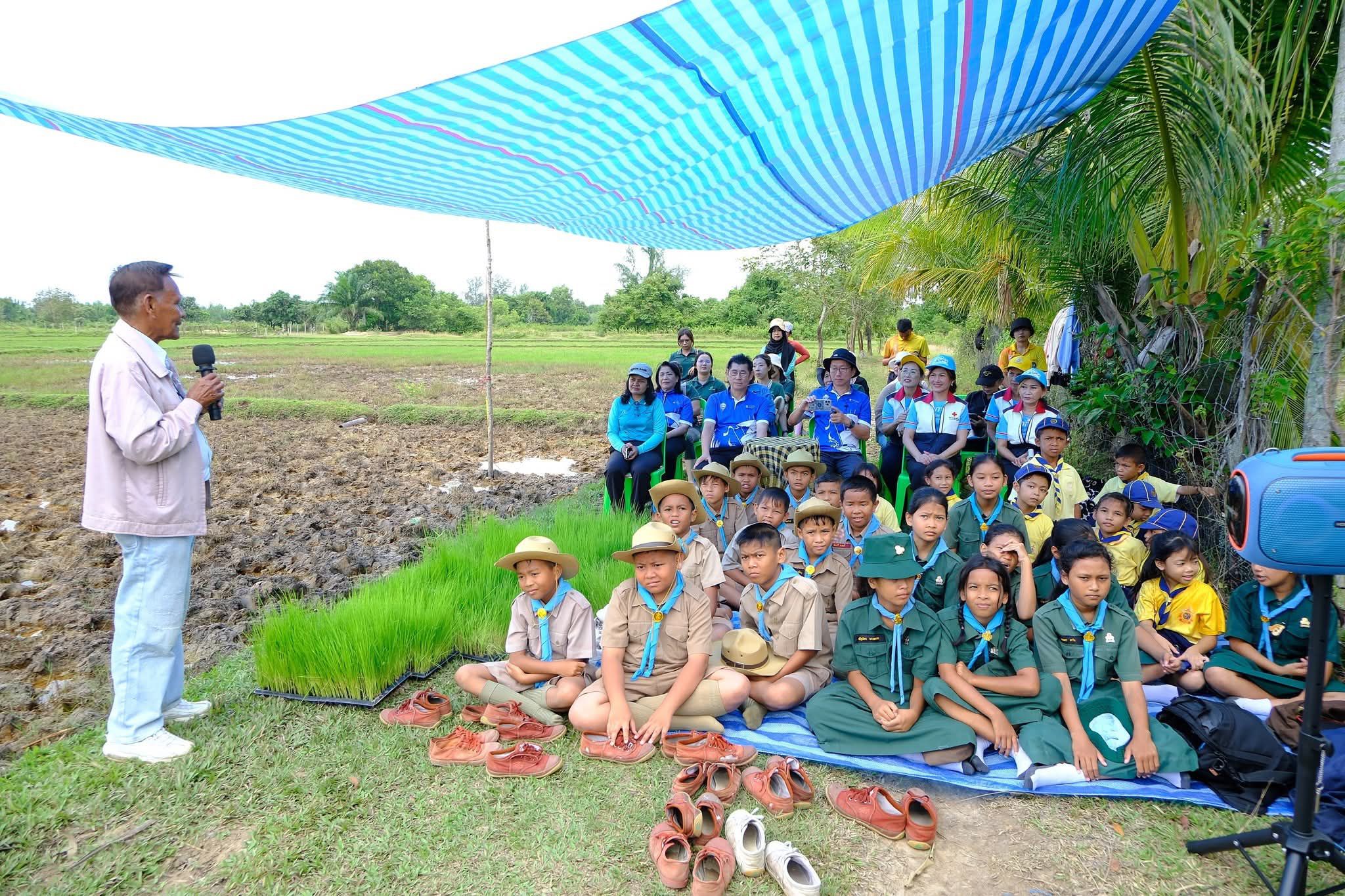 💢น.ส.สาขนันท์ ลีลาประศาสน์ ประธานกลุ่มนักธุรกิจรุ่นใหม่ YEC หอการค้าจังหวัดกระบี่ พนักงานเจ้าหน้าที่หอการค้าจังหวัดกระบี่ คณะครู นักเรียนโรงเรียนบ้านเกาะกลาง คณะครู นักเรียนโรงเรียนบ้านคลองประสงค์ นักเรียนจากโรงเรียนลำทับประชานุเคราะห์ เดินทางมาศึกษาดูงาน และร่วมกิจกรรม “#โยนกล้าข้าว”ที่แปลงนาสาธิต