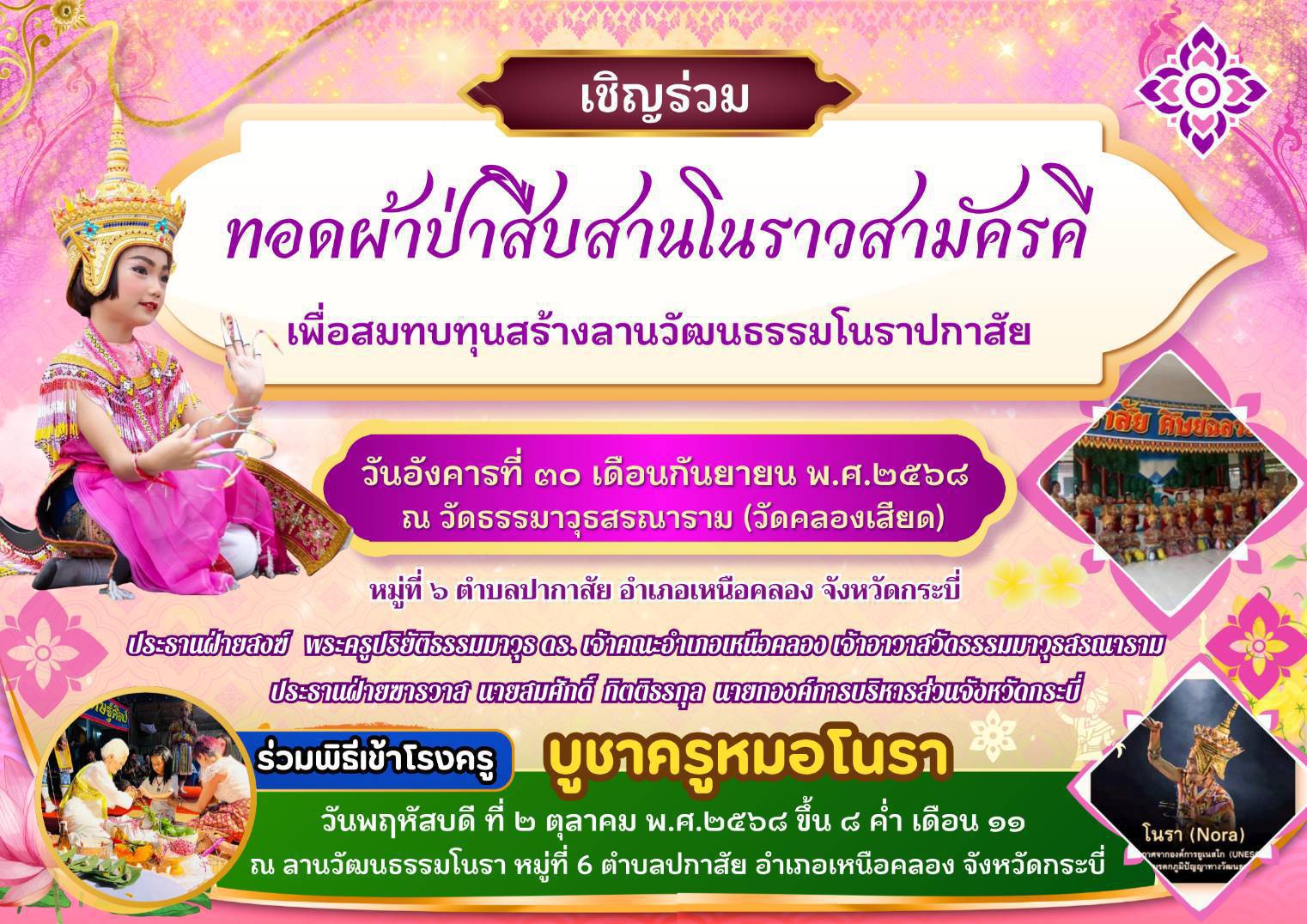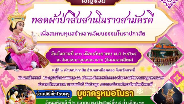 **กระบี่:** วัดธรรมวุฒิสรณาราม (วัดคลองเสียด) อำเภอเหนือคลอง จังหวัดกระบี่ เตรียมจัดงานใหญ่ **”ทอดผ้าป่าสืบสานโนราสามัคคี”** และ **”พิธีเข้าโรงครู บูชาครูหมอโนรา”** เพื่อระดมทุนสร้าง **”ลานวัฒนธรรมโนราปกาสัย”** ซึ่งจะใช้เป็นศูนย์กลางในการอนุรักษ์และสืบสานศิลปะการแสดงท้องถิ่นอย่างโนราให้คงอยู่สืบไป