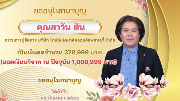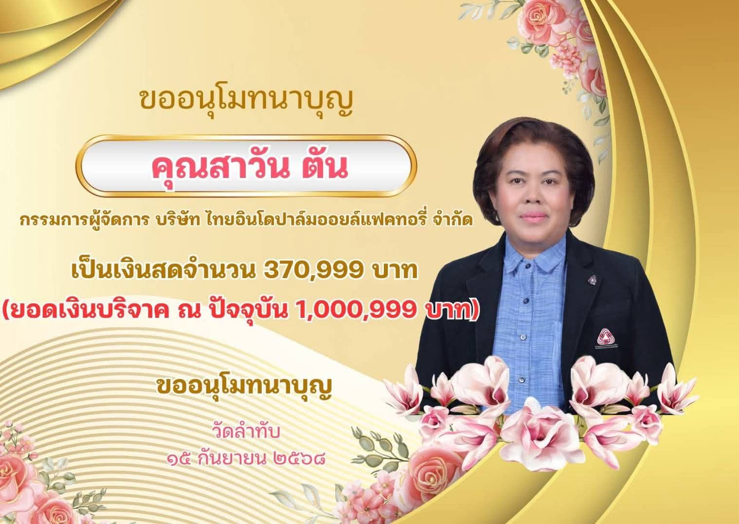 จำนวน ๓๗๐,๙๙๙ บาท (สามแสนเจ็ดหมื่นเก้าร้อยเก้าสิบเก้าบาทถ้วน) วันที่ ๑๒ มิถุนายน ๒๕๖๘ (ครั้งที่ ๒) บริจาคเป็นเงินสด