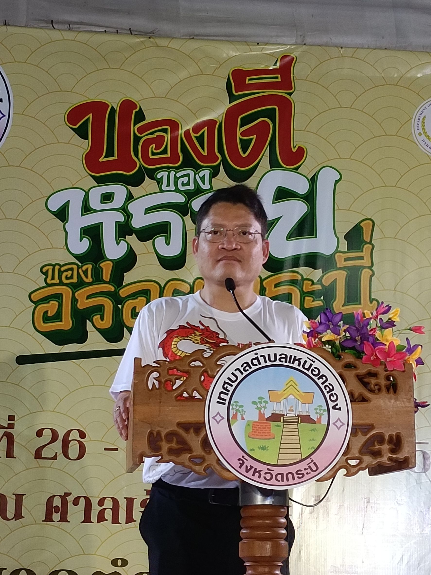 📌นายปองพล ซ้ายเส้ง นายกเทศมนตรีตำบลเหนือคลอง ในฐานะประธานกรรมการดำเนินโครงการจัดงานมหกรรมส่งเสริมอาหารพื้นถิ่นเหนือคลอง ประจำปี 2568 กล่าวรายงาน
