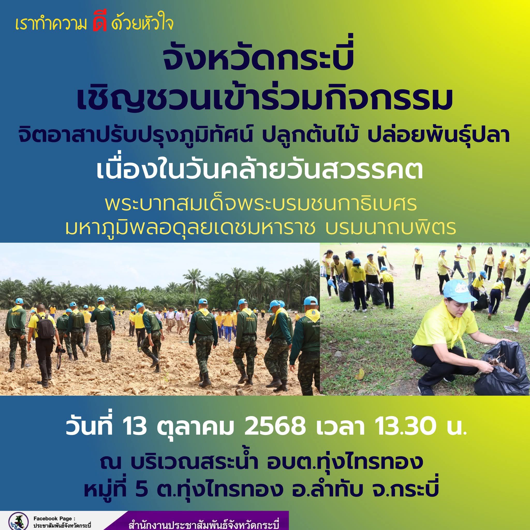 #จังหวัดกระบี่เชิญชวนทุกภาคส่วนร่วมกิจกรรมจิตอาสา เนื่องในวันคล้ายวันสวรรคต พระบาทสมเด็จพระบรมชนกาธิเบศร มหาภูมิพลอดุลยเดชมหาราช บรมนาถบพิตร 13 ตุลาคม 2568