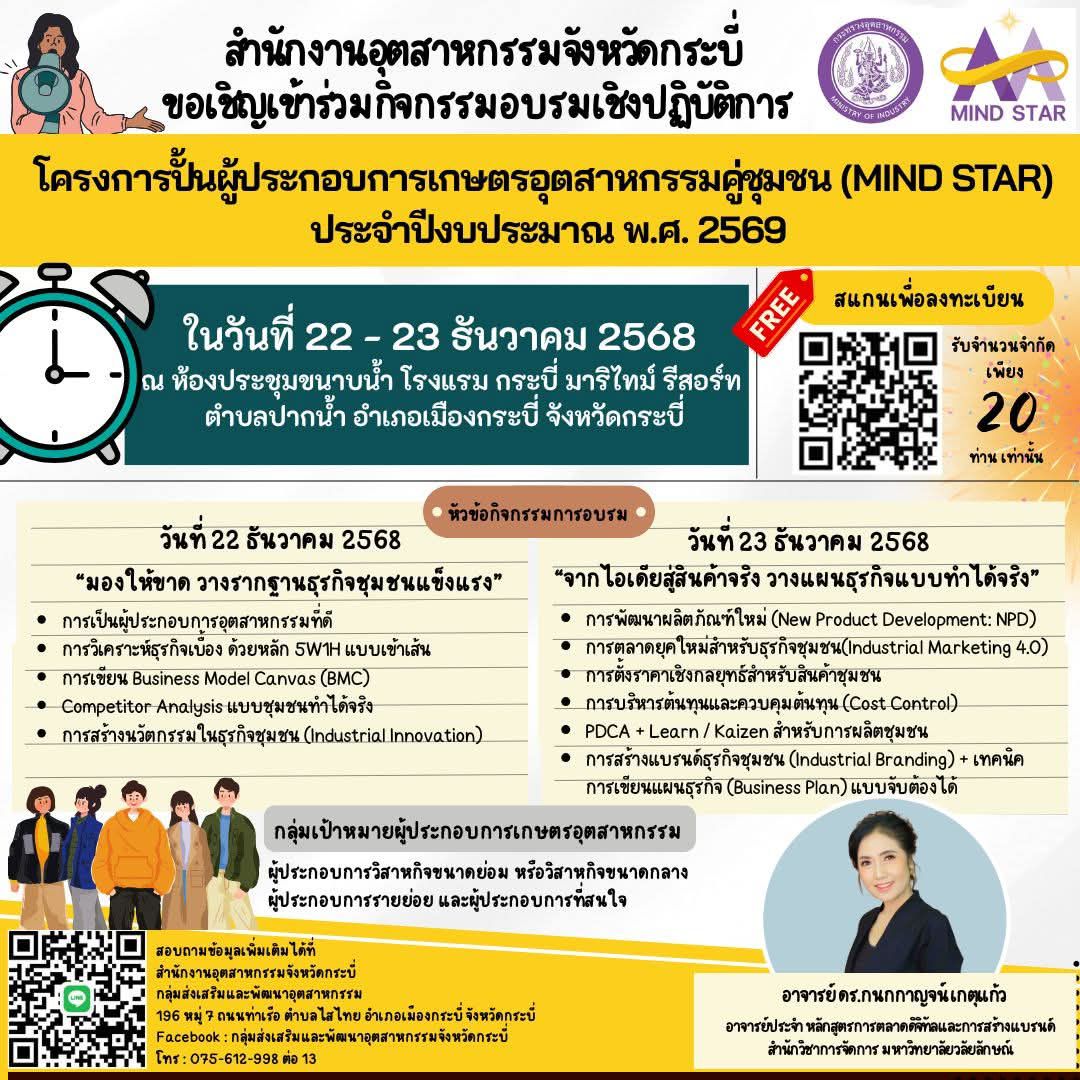 สำนักงานอุตสาหกรรมจังหวัดกระบี่ ขอเชิญท่านเข้าร่วมอบรมเชิงปฏิบัติการ ภายใต้โครงการปั้นผู้ประกอบการเกษตรอุตสาหกรรมคู่ชุมชน (MIND STAR) ประจำปีงบประมาณ พ.ศ. 2569 เพื่อบ่มเพาะการเป็นผู้ประกอบการเกษตรอุตสาหกรรมที่ดีคู่ชุมชนในพื้นที่ พร้อมส่งเสริมและพัฒนาทักษะการดำเนินธุรกิจที่สะท้อนถึงคุณค่าของชุมชน แนะนำการตลาด ช่องทางการขายที่เหมาะสม และวิเคราะห์ธุรกิจเบื้องต้นให้แก่ผู้ประกอบการเกษตรอุตสาหกรรม