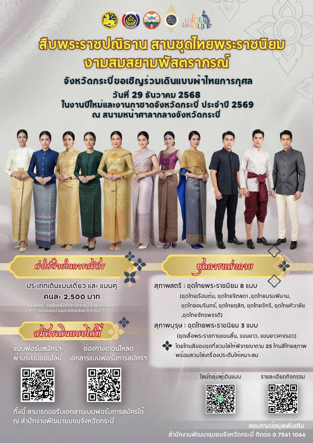 จังหวัดกระบี่ ขอเชิญชวนหัวหน้าส่วนราชการ หัวหน้าหน่วยงานภาครัฐ ภาคเอกชน ประชาชน นักเรียนนักศึกษา และผู้ที่สนใจทั่วไป ทั้งชาย-หญิง LGBTQ สมัครเข้าร่วมเดินแบบผ้าไทยการกุศล ด้วยชุดไทยพระราชนิยม ในคืนวันที่ 29 ธันวาคม 2568 งานปีใหม่และงานกาชาดจังหวัดกระบี่ ประจำปี 2569
