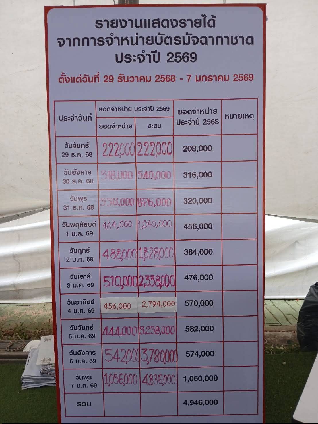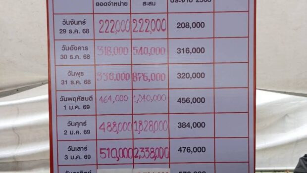 āļŠāļĢāļļāļāļĒāļāļāļāļģāļŦāļāđāļēāļĒāļĄāļąāļāļāļēāļāļēāļāļēāļāļāļąāļāļŦāļ§āļąāļāļāļĢāļ°āļāļĩāđ āļāļĢāļ°āļāļģāļāļĩ 2569 āļĢāļ§āļĄ 10 āļāļ·āļ - āļāļ·āļāļ§āļąāļāļāļĩāđ 29 āļ.āļ.68 āļ.āļĨāļģāļāļąāļ =222,000 āļāļēāļ -āļāļ·āļāļ§āļąāļāļāļĩāđ 30 āļ.āļ.68 āļ.āđāļŦāļāļ·āļāļāļĨāļāļ = 318,000 āļāļēāļ -āļāļ·āļāļ§āļąāļāļāļĩāđ 31 āļ.āļ.68 āļ.āđāļĄāļ·āļāļ=336,000 āļāļēāļ -āļāļ·āļāļ§āļąāļāļāļĩāđ 1 āļĄ.āļ.69 āđāļāļĻāļāļēāļĨāđāļĄāļ·āļāļ=464,000 -āļāļ·āļāļ§āļąāļāļāļĩāđ 2 āļĄ.āļ.69 āļ.āļāļĨāļēāļĒāļāļĢāļ°āļĒāļē = 488,000 āļāļēāļ -āļāļ·āļāļ§āļąāļāļāļĩāđ 3 āļĄ.āļ.69 āļ.āđāļāļēāļ°āļĨāļąāļāļāļē= 510,000 -āļāļ·āļāļ§āļąāļāļāļĩāđ 4 āļĄ.āļ. 69 āļ.āđāļāļēāļāļāļĄ = 456,000.- -āļāļ·āļāļ§āļąāļāļāļĩāđ 5 āļĄ.āļ..69 āļ.āļāļĨāļāļāļāđāļāļĄ=444,000 -āļāļ·āļāļ§āļąāļāļāļĩāđ 6 āļĄ.āļ.69 āļ.āļāđāļēāļ§āļĨāļķāļ=542,000.- -āļāļ·āļāļŠāļļāļāļāđāļēāļĒāļ§āļąāļāļāļĩāđ 7 āļĄ.āļ.69 āļāļāļ.āļāļĢāļ°āļāļĩāđ = 1,056,000