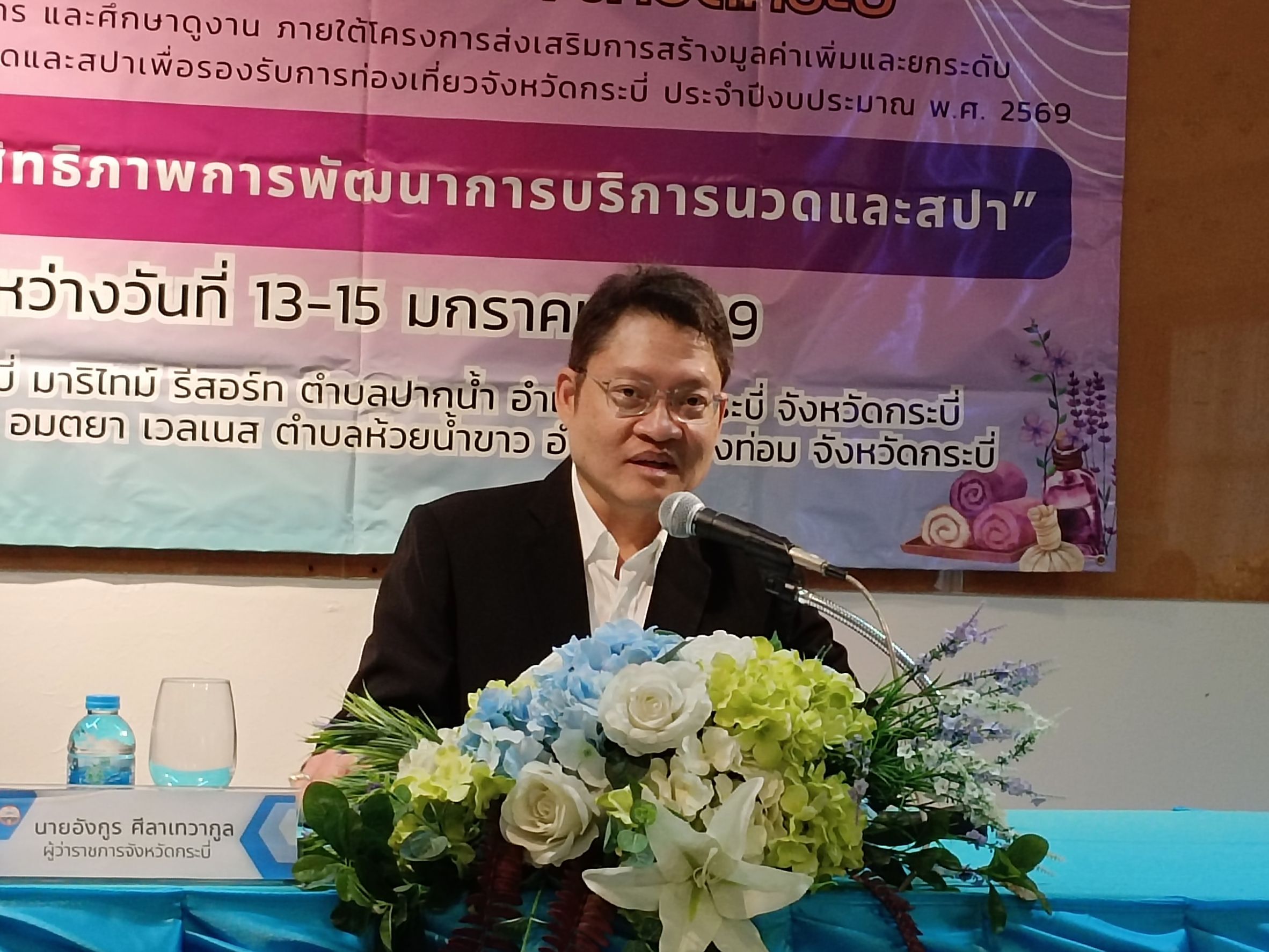 นายอังกูร ศีลาเทวากูล ผู้ว่าราชการจังหวัดกระบี่ เป็นประธาน การสัมมนาเชิงปฏิบัติการและศึกษาดูงาน "การเพิ่มประสิทธิภาพการพัฒนาการบริการนวดและสปา ภายใต้โครงการส่งเสริมการสร้างมูลค่าเพิ่มและยกระดับสถานบริการเพื่อสุข ภาพนวดและสปา เพื่อรองรับการท่องเที่ยวจังหวัดกระบี่ ประจำปีงบประมาณ พ.ศ. 2569 ระหว่างวันที่ 13-15 มกราคม 2569 ณ โรงแรมกระบี่ มาริไทม์ รีสอร์ท ตำบลปากน้ำ อำเภอเมืองกระบี่ จังหวัดกระบี่ และศึกษาดูงาน ที่บริษัท อมตเฮลท์แคร์จำกัด เลขที่ 88/1 หมู่ 7 ตำบลห้วยน้ำขาว อำเภอคลองท่อม จังหวัดกระบี่