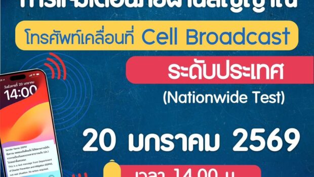 ปภ. เตรียมทดสอบ การแจ้งเตือนภัยผ่านสัญญาณ โทรศัพท์เคลื่อนที่ Cell Broadcast ระดับประเทศ (Nationwide Test) วันอังคารที่ 20 มกราคม เวลา 14:00 น.