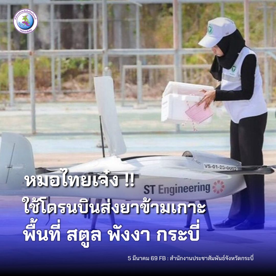 กระบี่ เหมาะมาก !!! หมอไทยเจ๋ง! ใช้โดรน “ส่งยา–วัคซีน” ข้ามทะเลลดเวลาขนส่งจาก 2 ชม. เหลือ 15 นาที ทดลองเส้นทาง สตูล พังงา กระบี่