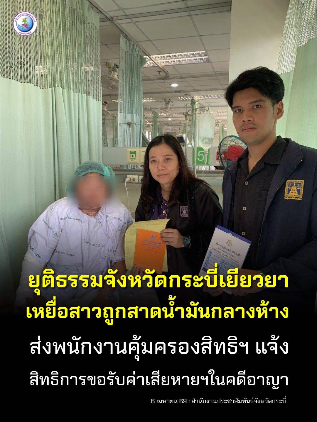 ยุติธรรมจังหวัดกระบี่ ส่งพนักงานคุ้มครอง สิทธิฯ เยี่ยมผู้เสียหาย เหตุถูกสาดน้ำมันร้อน