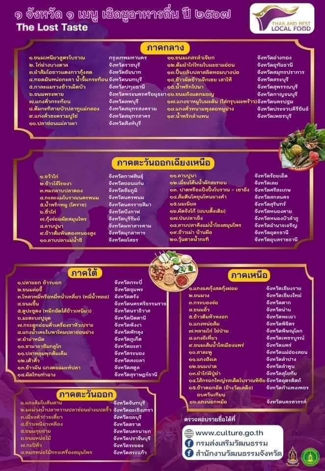 กระทรวงวัฒนธรรม โดยกรมส่งเสริมวัฒนธรรม ประกาศรายชื่อ“1 จังหวัด 1 เมนู เชิดชูอาหารถิ่น” 77 จังหวัดและกรุงเทพมหานคร โครงการส่งเสริมและพัฒนายกระดับอาหารถิ่นสู่มรดกทางวัฒนธรรมและอัตลักษณ์ความเป็นไทย (Thailand Best Local Food) “รสชาติ..ที่หายไป The Lost Taste” ประจำปีงบประมาณ พ.ศ. 2567