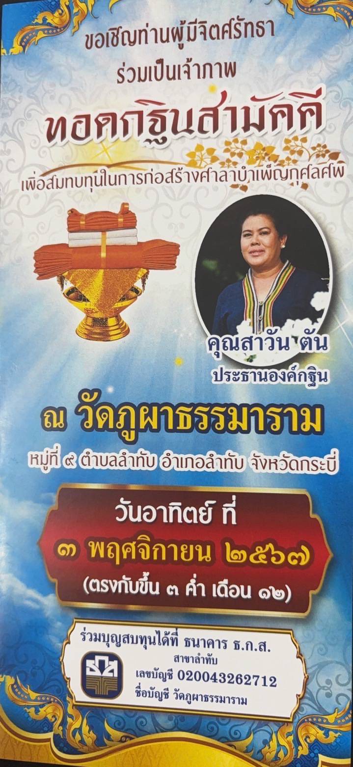 #กำหนดการกฐินสามัคคี ณ วัดผูผาธรรมาราม หมู่ 9 ตำบลลำทับ อำเภอลำทับ จ.กระบี่