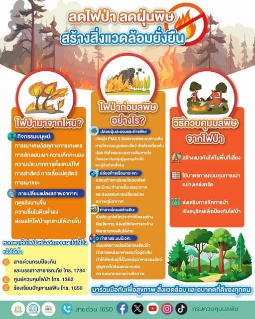 ทุกภาคส่วนต้องร่วมมือกันในการลดปัญหาไฟป่าและฝุ่น PM2.5 เพื่อสร้างสภาพแวดล้อมที่ดีและยั่งยืนให้กับคนรุ่นหลัง หากพบเห็นเหตุการณ์ไฟป่า สามารถแจ้งเหตุได้ทันทีที่สายด่วน 1650