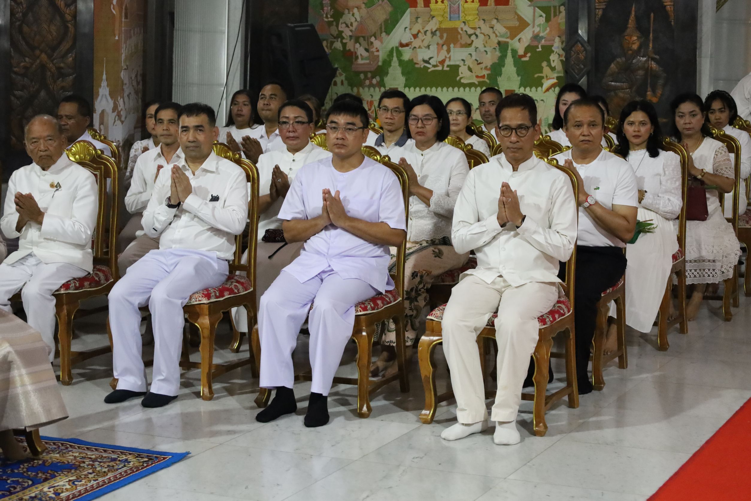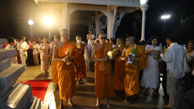 โดยมีนางศรินทิพย์ ศีลาเทวากูล นายกเหล่ากาชาดจังหวัด หัวหน้าส่วนราชการ ข้าราชการ พุทธศาสนิกชนที่พร้อมใจกันแต่งกายด้วยชุดสีขาวเข้าร่วมพิธีทางศาสนาและและร่วมเวียนเทียนรอบอุโบสถ จำนวน 3 รอบ..