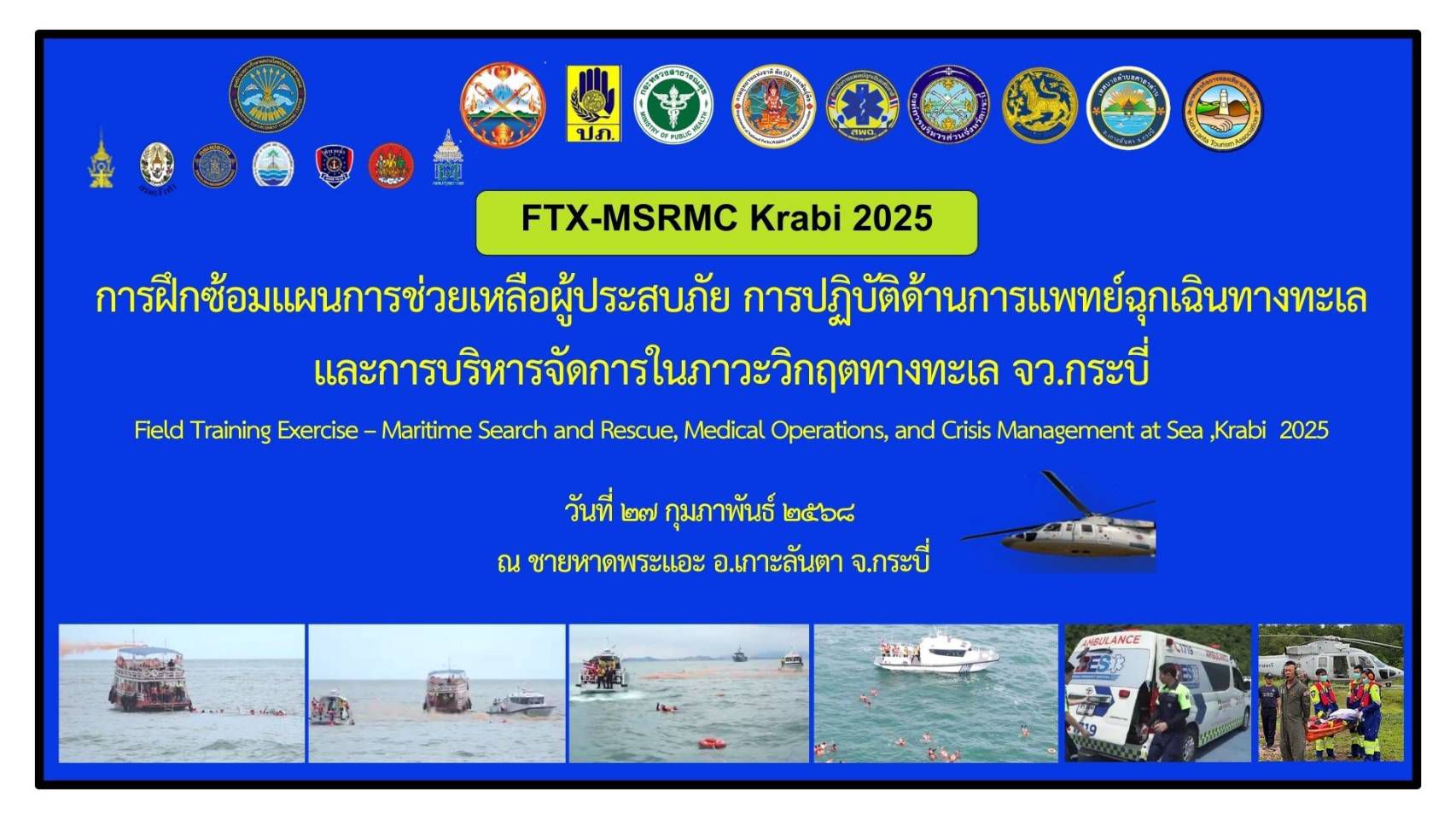 วันที่ 27 ก.พ.68 ศรชล.จว.กระบี่ และ ศคท.จว.กระบี่ จับมือ ปภ.จว.กระบี่, สพฉ. และหน่วยงานที่เกี่ยวข้อง (ตามคำสั่งจัดตั้งศูนย์บัญชาการป้องกันและช่วยเหลือผู้ประสบภัยทางทะเลจังหวัดกระบี่) ทำการฝึกปฏิบัติภาคสนาม/ภาคทะเล ในพื้นที่ทางทะเลของ จว.กระบี่ ในหัวข้อ