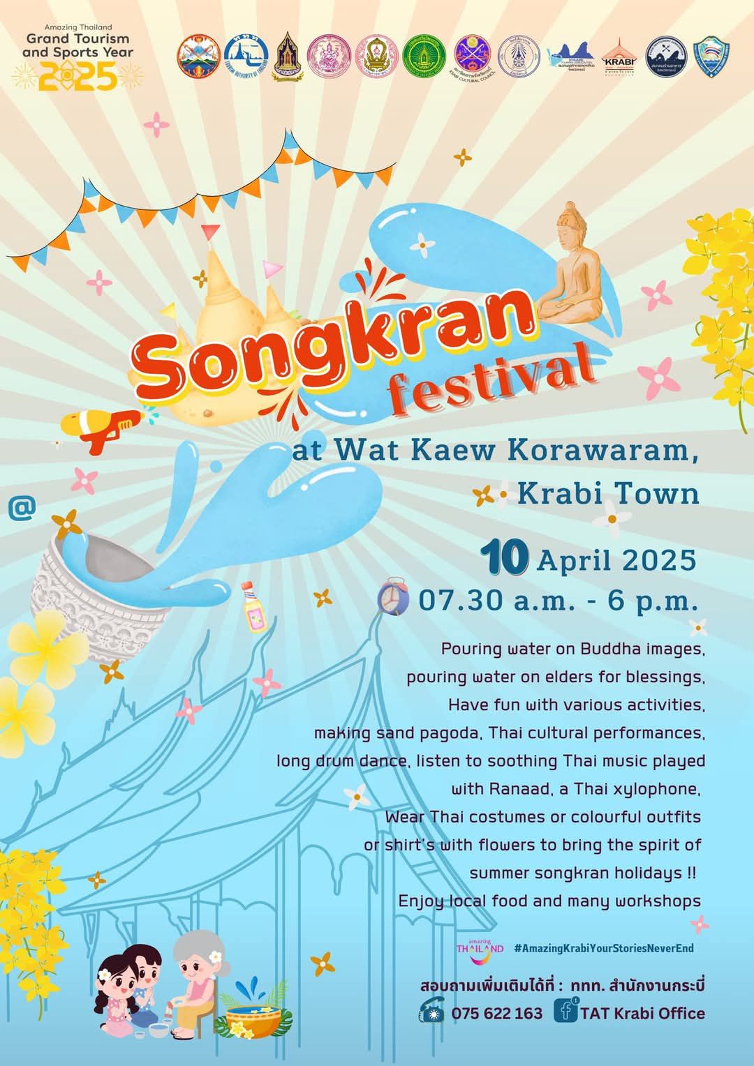สงกรานต์วัดแก้ว @Krabi Town … 🗓10 เมษายน 2568 07.30 – 18.00 น. ณ วัดแก้วโกรวาราม พระอารามหลวงกลางเมืองกระบี่