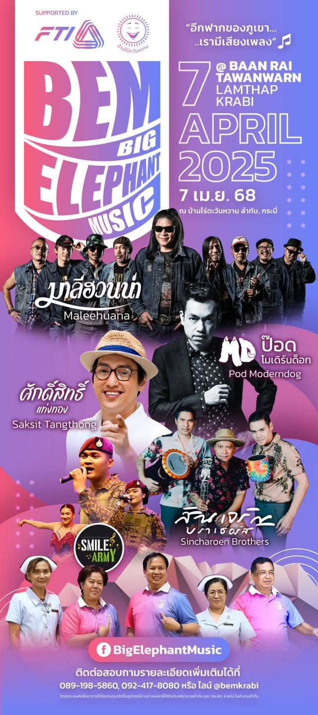 ติดต่อสอบถามรายละเอียดเพิ่มเติมได้ที่ Bigelephantmusic , บ้านไร่ตะวันหวาน กระบี่ Baan Rai TawanWarn Krabi หรือ Line : @bemkrabi #BEMbigelephantmusic #bem2025 #bigelephantmusic #baanraitawanwarn #bigelephantmusickrabi #บ้านไร่ตะวันหวาน #คอนเสิร์ตกระบี่ #ไร่ตะวันหวาน #มาลีฮวนน่า #ป๊อดโมเดิร์นด็อก #สินเจริญบราเธอร์ส #ยิ้มกว้าง #smilearmy