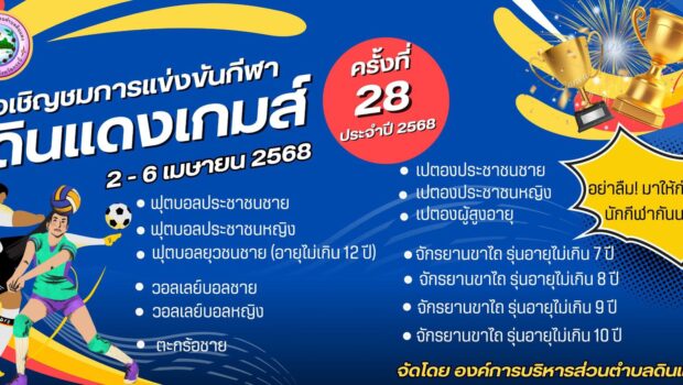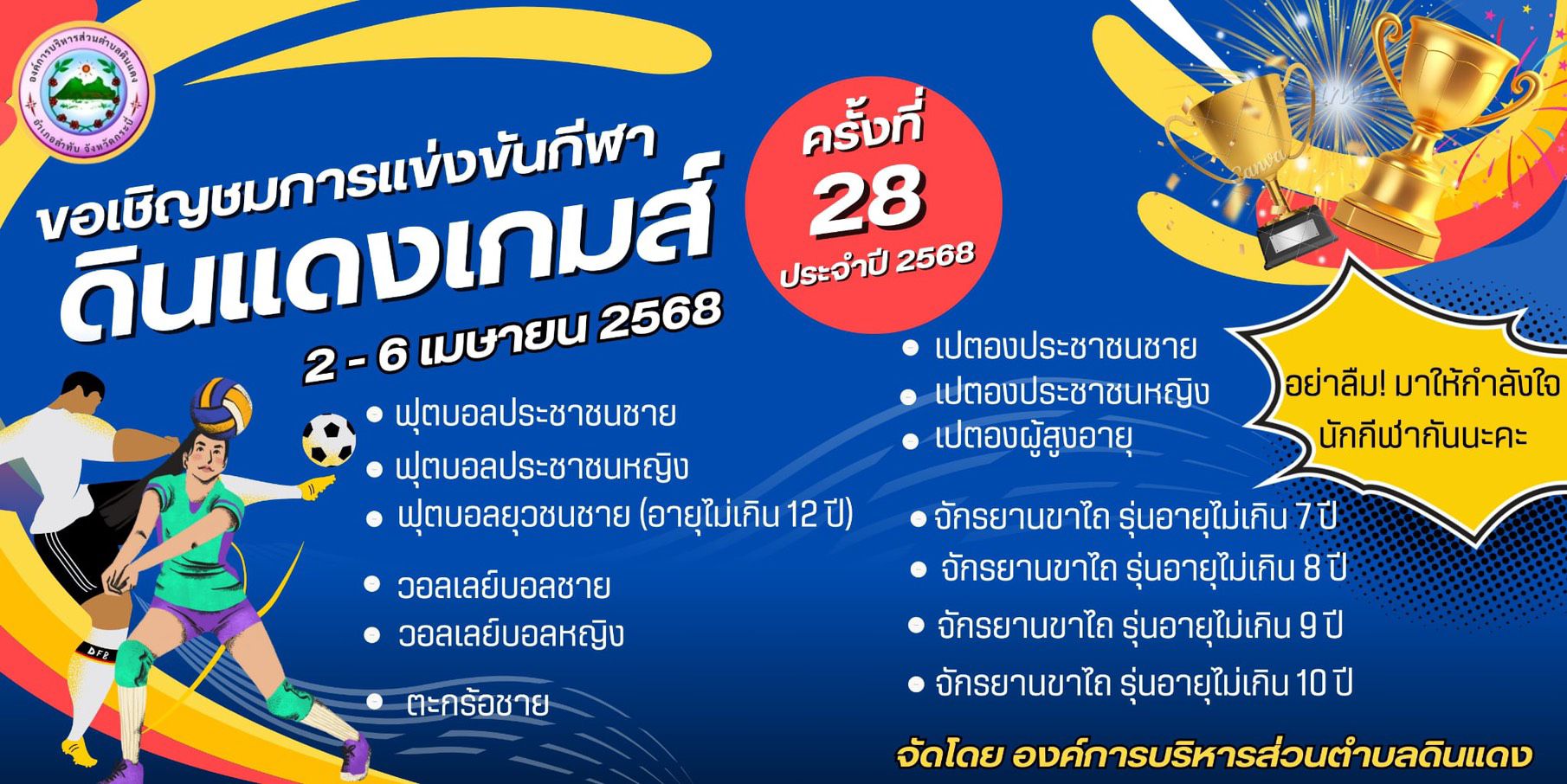 ขอเชิญชวนทุกท่านร่วมสนุกและเชียร์นักกีฬาในการแข่งขันกีฬา ดินแดงเกมส์ ครั้งที่ 28ประจำปี 2568
