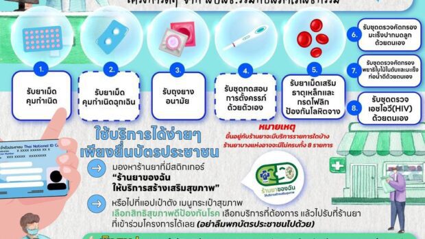 สุขภาพดีป้องกันโรคที่ร้านยาด้วย 30 บาทรักษาทุกที่ คนไทยทุกคนใช้บริการได้ 1.ยาคุมกำเนิด 2.ยาคุมกำเนิดฉุกเฉิน 3.ถุงยางอนามัย 4.ชุดทดสอบการตั้งครรภ์ 5.ยาเสริมธาตุเหล็กป้องกันโลหิตจาง 6.ชุดตรวจคัดกรองด้วยตนเอง (มะเร็งปากมดลูก, เอชไอวี, พยาธิใบไม้ตับ) • ร้านยาที่มีสติกเกอร์ ร้านยาของฉัน ให้บริการสร้างเสริมสุขภาพ • แอปเป๋าตัง เมนูกระเป๋าสุขภาพ เลือกสิทธิสุขภาพดีป้องกันโรค https://www.nhso.go.th/th/communicate-th/thnewsforperson/2025-04-03-02-28-05 สอบถามเพิ่มเติม สายด่วน สปสช. 1330
