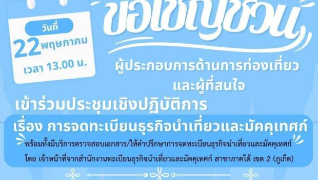 กระบี่เชิญชวนผู้ประกอบการท่องเที่ยวร่วมประชุมเชิงปฏิบัติการ “จดทะเบียนธุรกิจนำเที่ยวและมัคคุเทศก์”