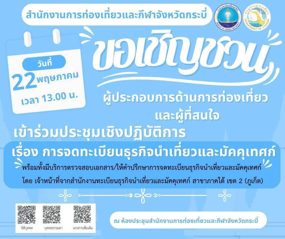 สำนักงานการท่องเที่ยวและกีฬาจังหวัดกระบี่ ขอเชิญผู้ประกอบการด้านการท่องเที่ยวและผู้ที่สนใจ เข้าร่วมประชุมเชิงปฏิบัติการเรื่อง “การจดทะเบียนธุรกิจนำเที่ยวและมัคคุเทศก์” ในวันที่ 22 พฤษภาคม เวลา 13.00 น. ณ ห้องประชุมสำนักงานการท่องเที่ยวและกีฬาจังหวัดกระบี่